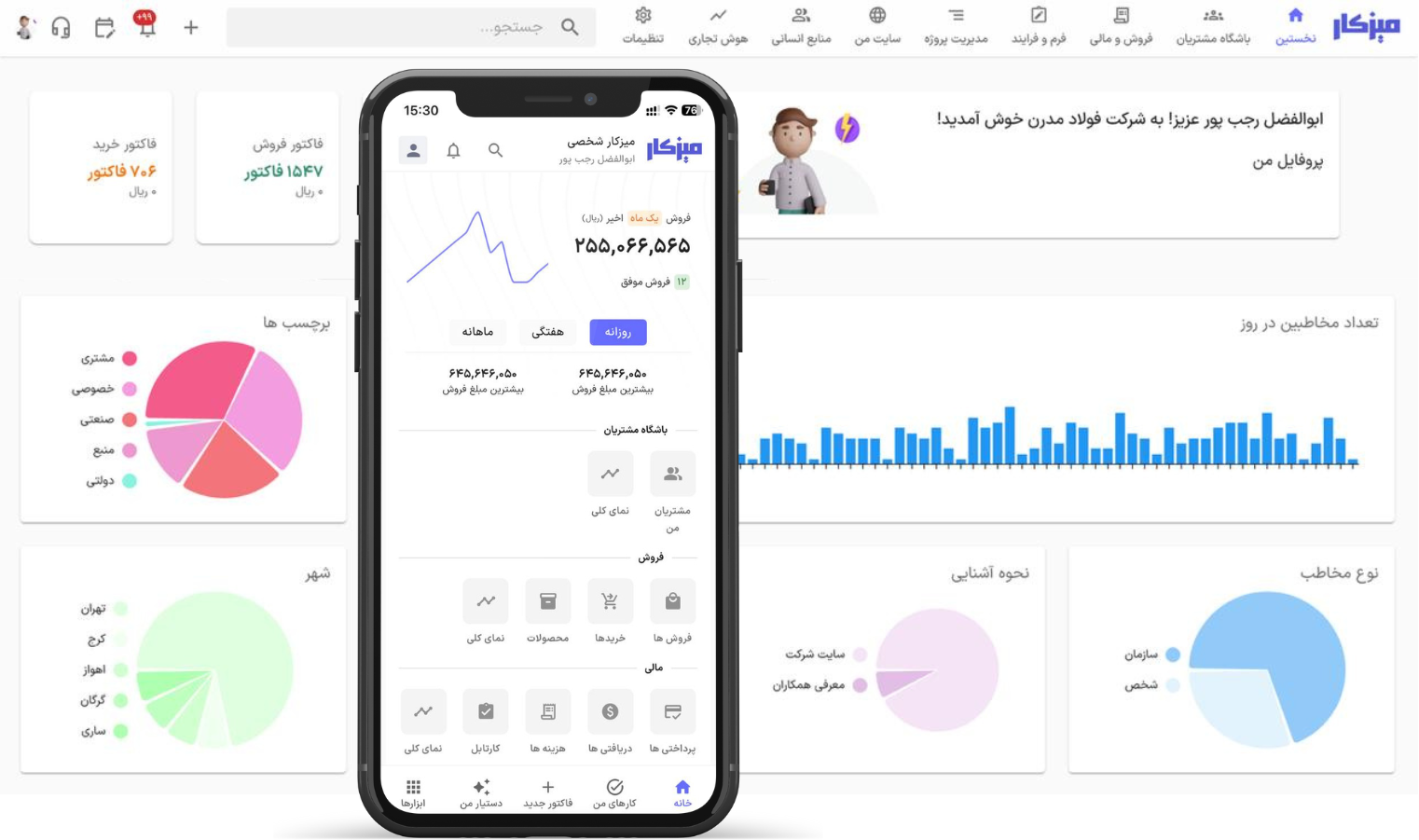 نسخه موبایل میزکار برای مدیران و فروشندگان همیشه آماده است. از هرجا که هستید، میتونید وضعیت فروش، مشتریان و گزارشات رو ببینید.
